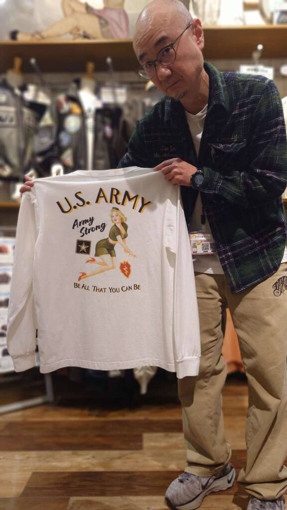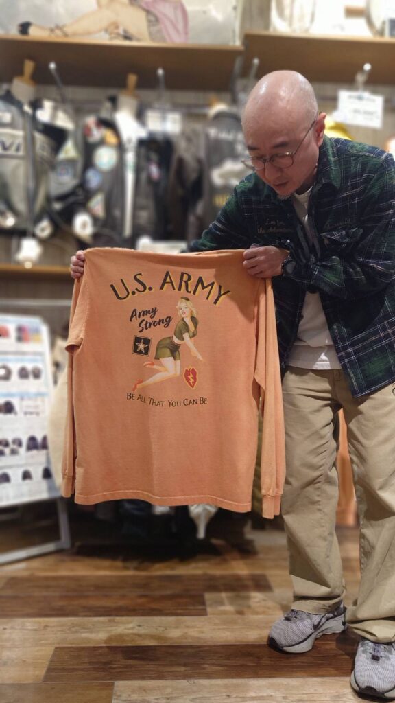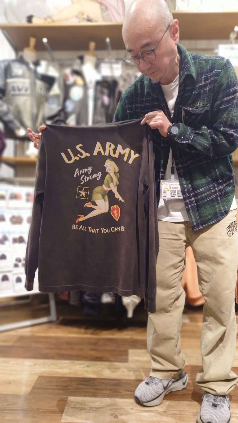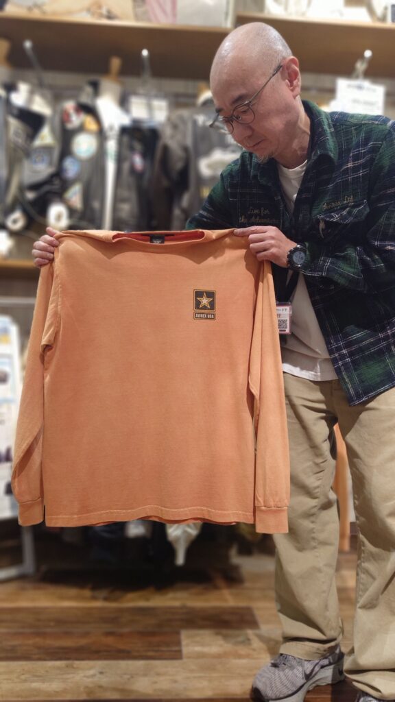 AVIREXらしい長袖Tシャツ 。左胸には、ブランドロゴをプリント 、背中にはアメリカ陸軍をイメージとしたピンナップガールをプリント 。ホワイトは従来通りの洗い仕上 、オレンジとチャコールは製品染めとスプレーブリーチを施し、自然なユーズド感を表現 。硬い肌触りが特徴的な空紡糸天竺を使用 。バランスの良いシルエットです。