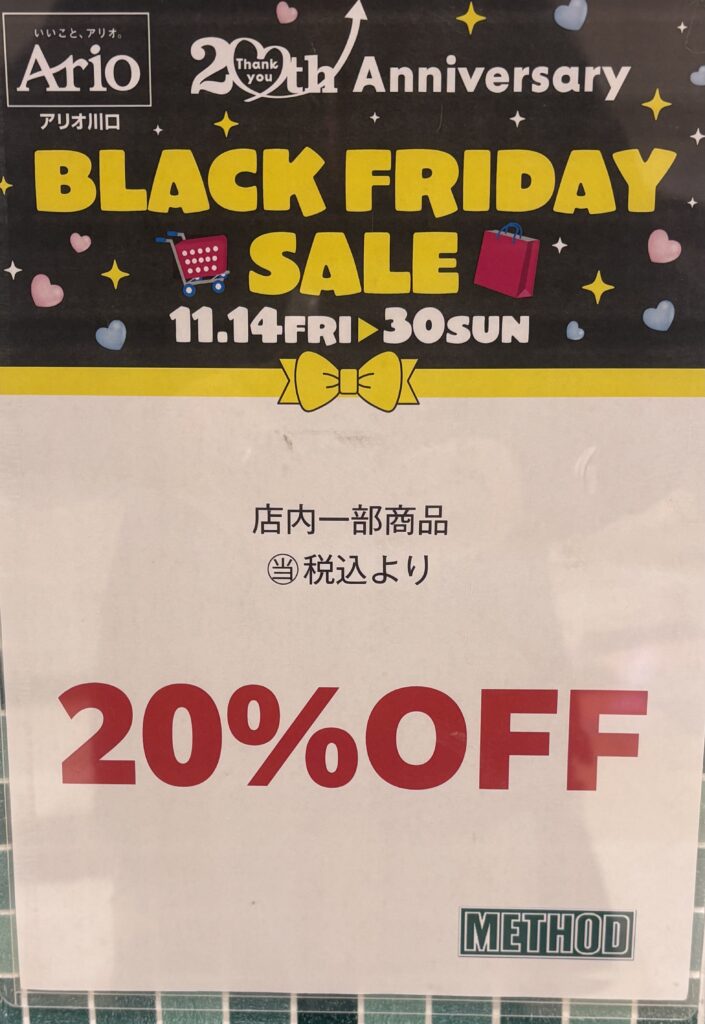 アリオ川口2階のメソッドはただいまブラックフライデー開催してます。