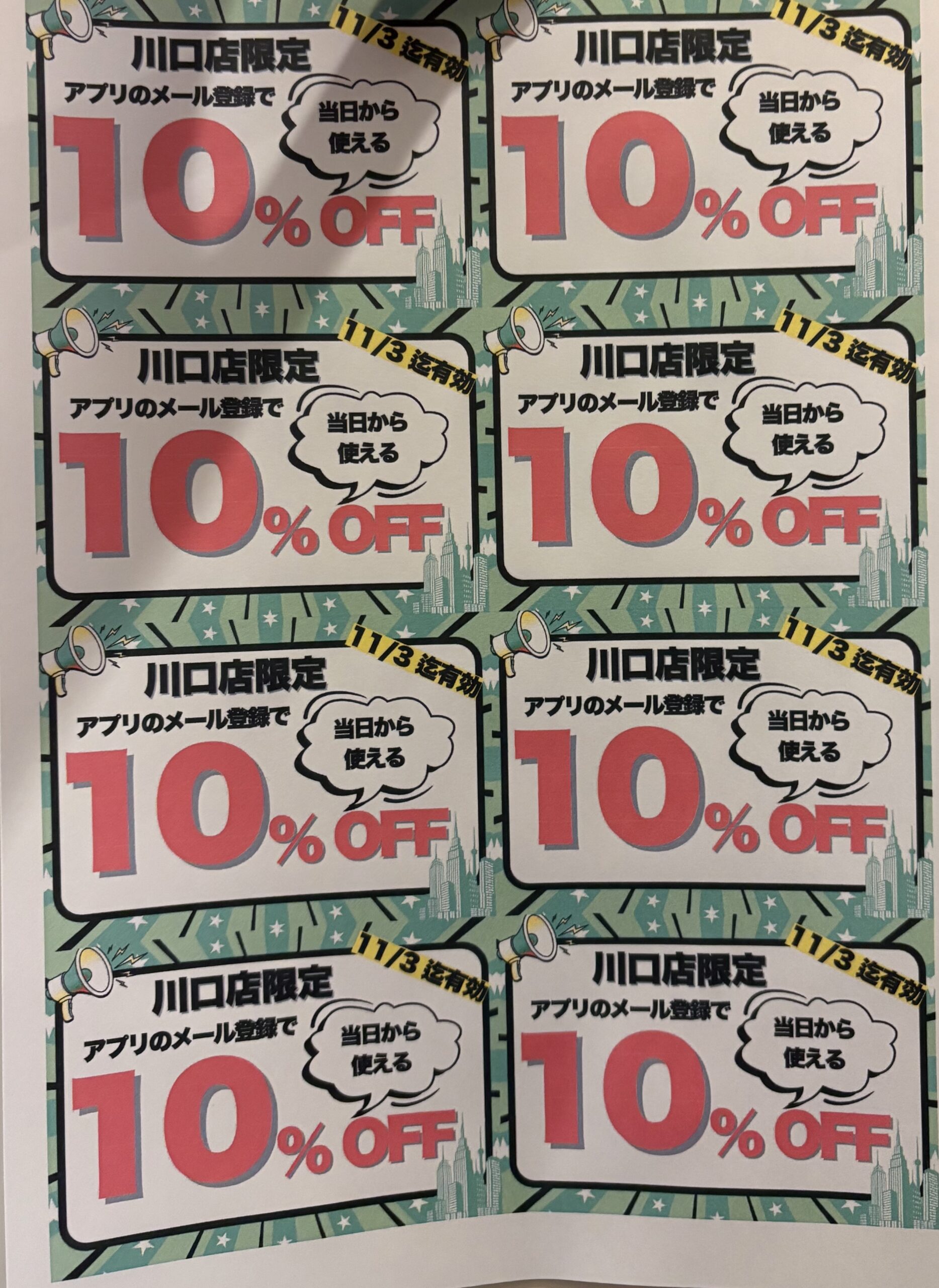 11月3日までの期間川口店限定でアプリ新規会員登録した方がご利用できる10%OFFのクーポンをお配りしてます