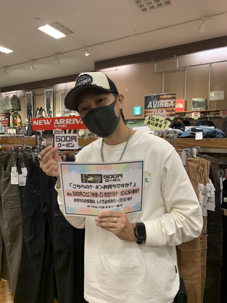 5,000円ごとに1枚使用可能でAVIREXやSALE商品も対象なのでお持ちの方は是非ご来店下さい!!!