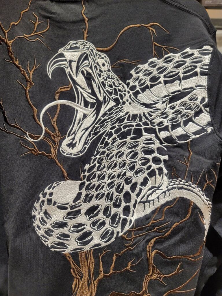 大きく口をあけた蛇は背景にいたるまで全て刺繍。プリントなしのデザインです。カラー黒のみ
