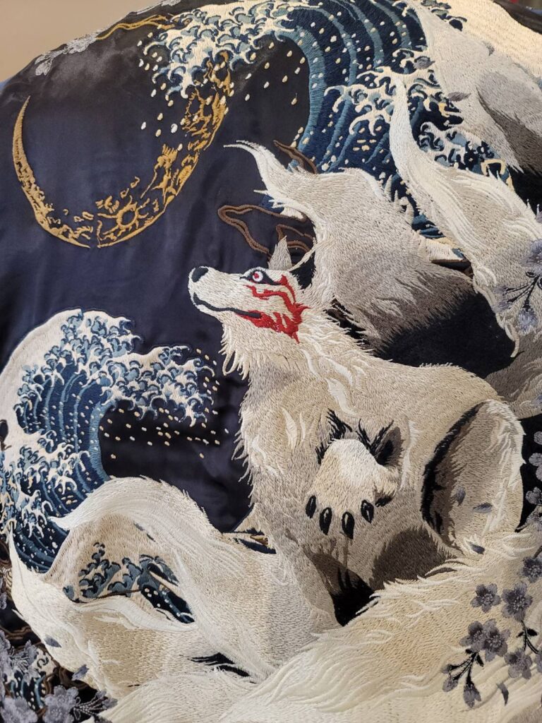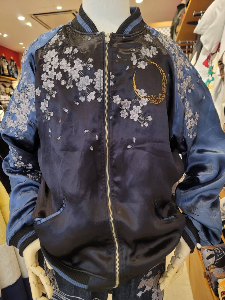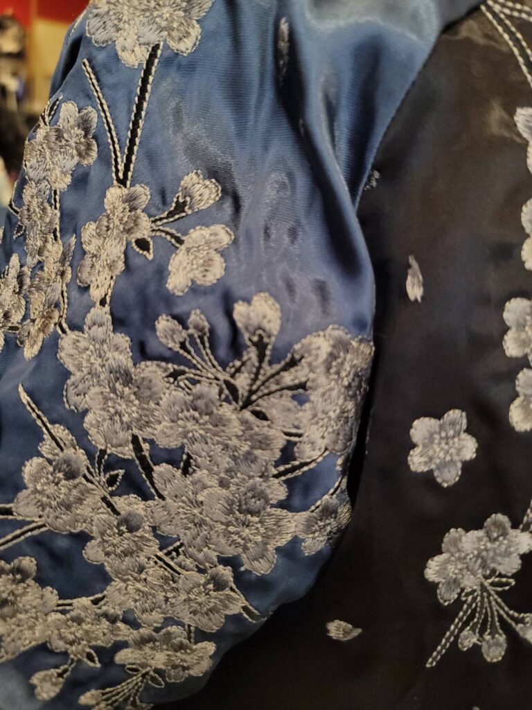袖のカラーは珍しい紺色、桜の刺繍が背面から途切れることなく施されていて袖を通せば立体感が増して迫力抜群