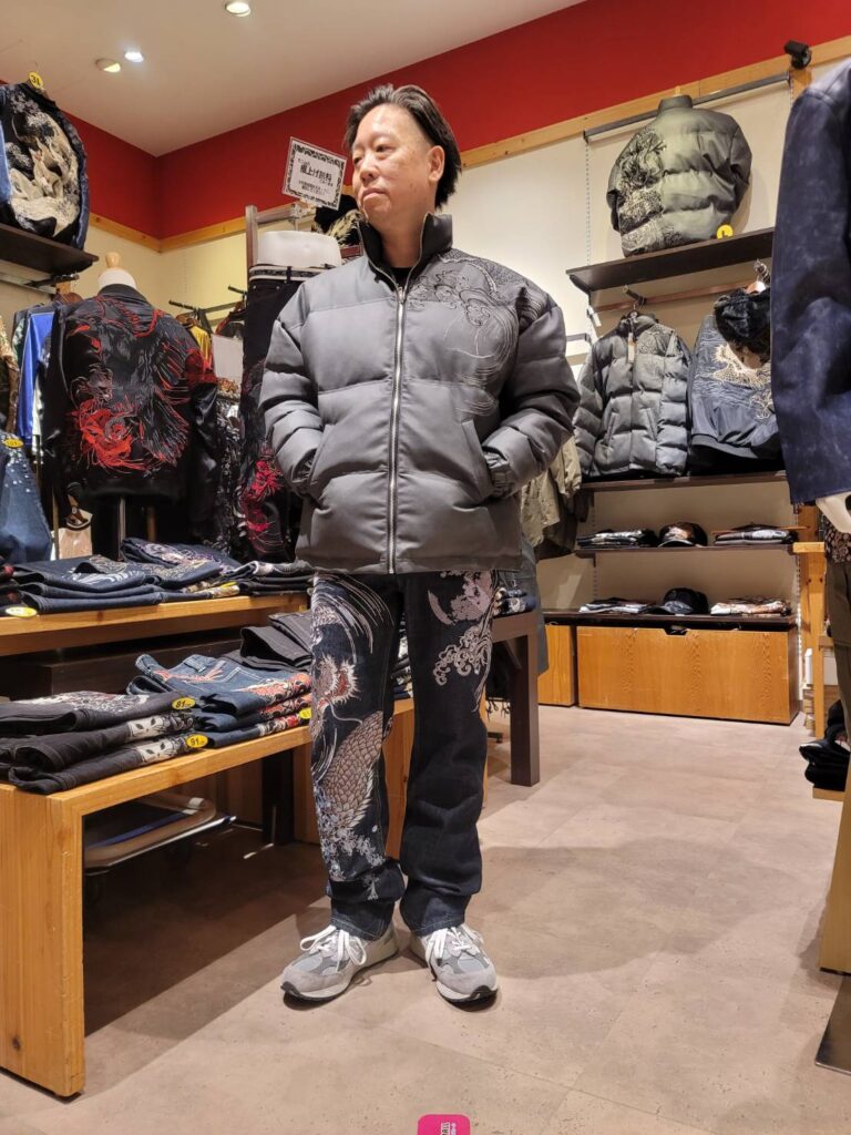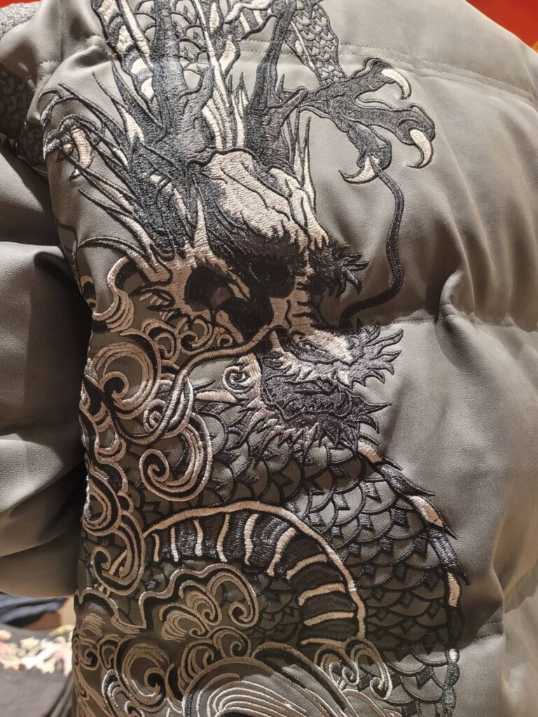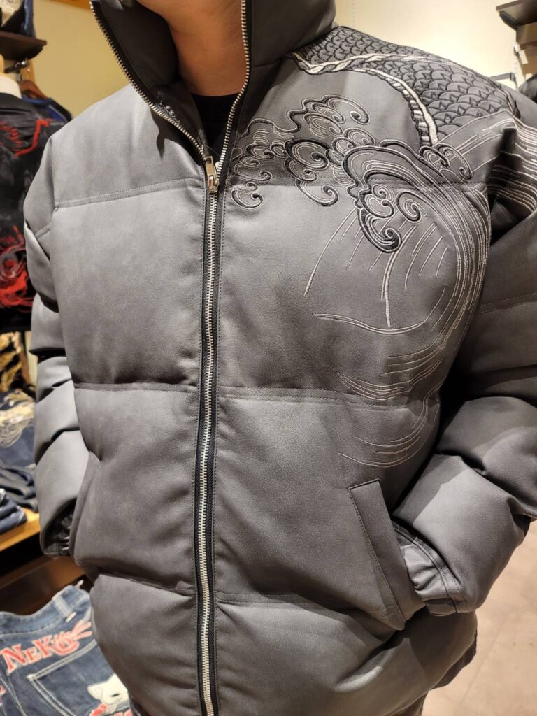 【絡繰魂・粋】より、龍刺繍の暖かい中綿ジャケットが登場。雨に濡れてもサッと拭けるPU素材で風にも強いです。