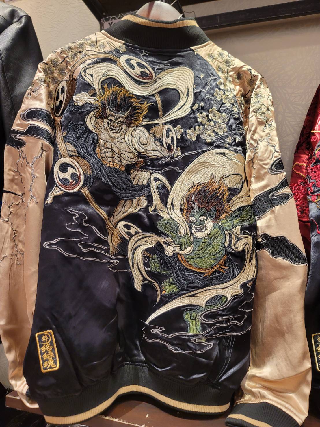 【絡繰魂・粋】より、スカジャンの新柄が入荷! 久々の鬼風神雷神 リバーシブルで内側は背中に桜流水の刺繍がはいっています 【税込価格¥38,500】 あべの店L~3Lの入荷です!気になった方はお早めに!