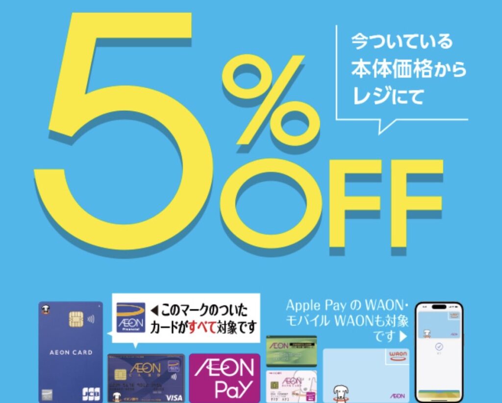 イオンカード、WAON、AEON Pay、WAONPOINTカードのご利用・ご提示で5%オフ!