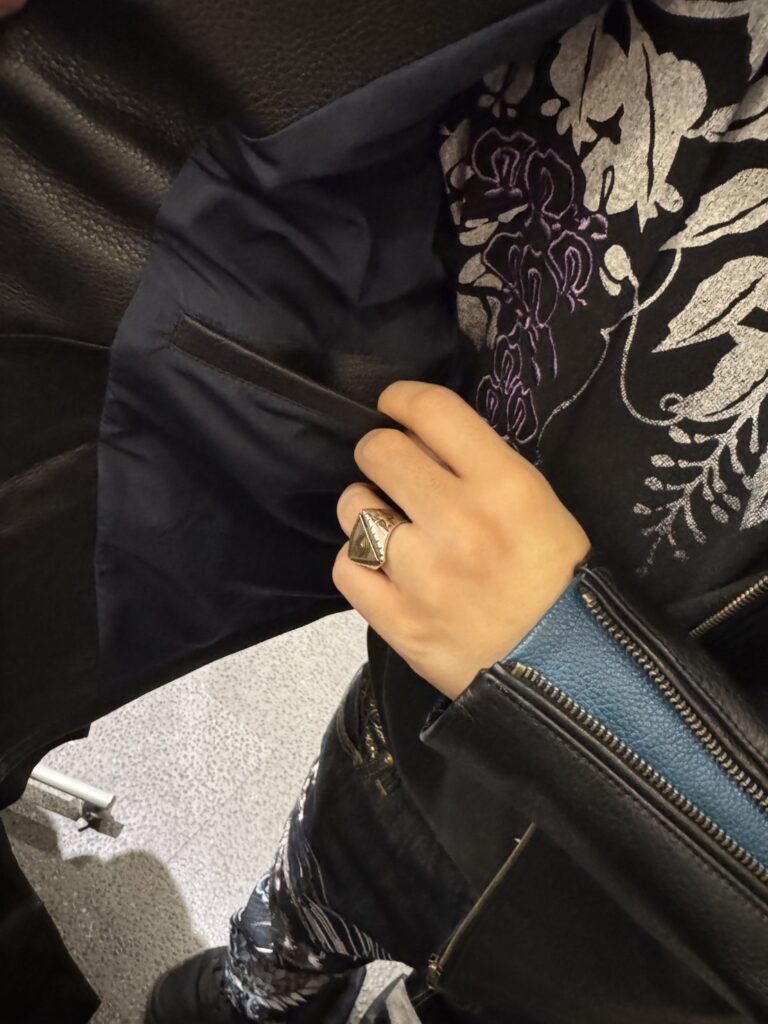 インナーはネイビー。今回袖の部分は青いレザーを使用しております!
